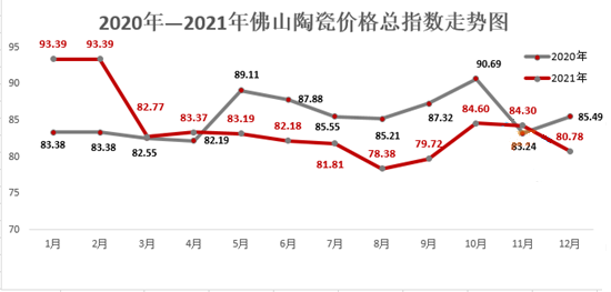 2021年行業運行態勢呈現前暖后冷的特點。主要受三方面原因影響:第一、上半年國內疫情穩定,春節后全國各地市場需求強勁,建材行業呈現出小旺季;第二、2021年是十四五開局之年,上半年的經濟形勢表現出發展小高潮;第三、上半年全球經濟復蘇,外需經濟活躍,外貿訂單爆滿,但隨著下半年海運費的爆漲、疫情的不穩定、原材料漲價等因素影響,企業利潤空間急劇收縮,市場行情低迷下行。佛山陶瓷價格指數全年走勢與行業趨勢相符。