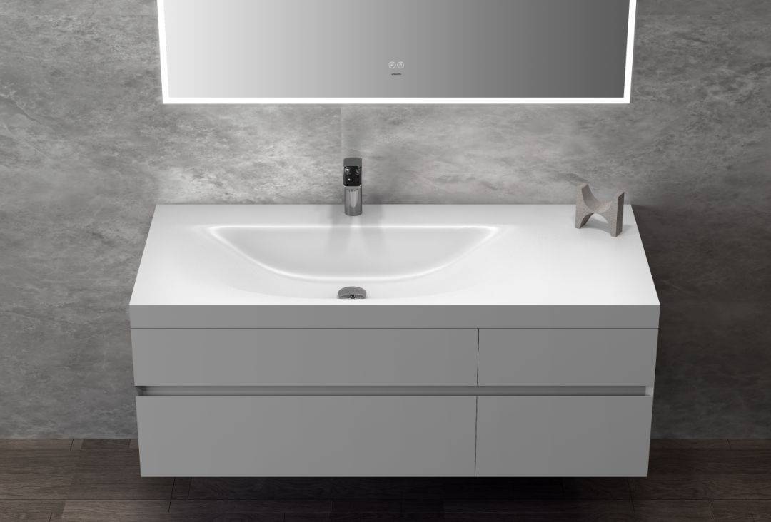 木里浴室柜臺面采用不同以往的啞光質地,做到保留亞克力材質優勢的同時,升級了觸感體驗,達到1+1>2的效果;其次,臺盆采用亞克力無縫一體工藝,流暢不藏垢,進一步改善日常清潔體驗。